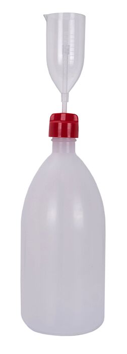 Kunststoff-Flasche zur Dosierung von flüssigen Peroxiden oder von Beschleunigern. Vorratsmenge 1l mit 50 ml Skala.