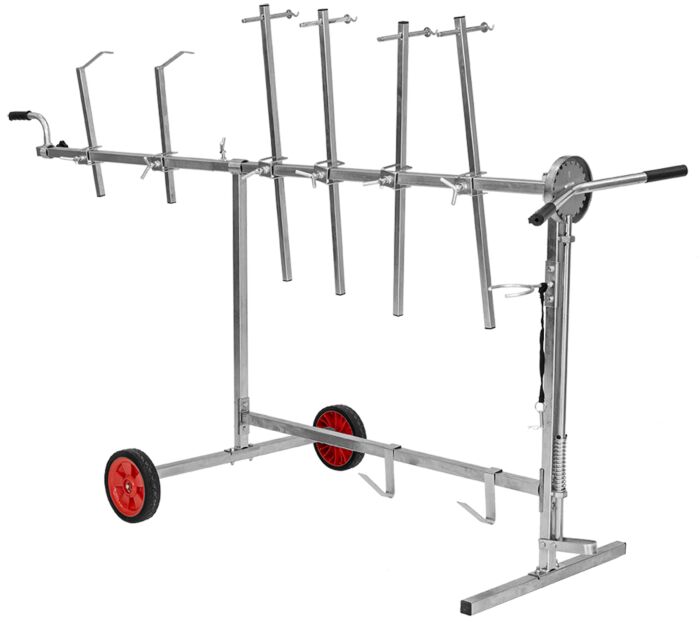 Dieser Drehlackierständer ist ein fahrbarer Drehlackierständer zur Aufnahme von Türen, Motorhauben, Stoßfänger, Kotflügel und diversen Kleinteilen. Er zeichnet sich durch gute und robuste Verarbeitung aus. Die extrem breiten Räder machen das Befahren eines Gitterrosts problemlos möglich.