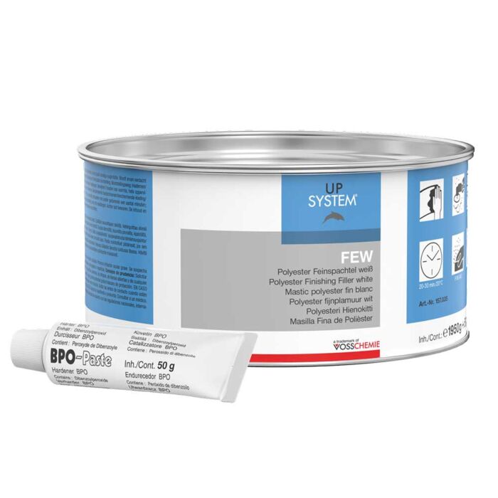UPS FEW (FERRO-ELASTIC-WEISS) ist eine besonders gut schleifbare, thixotrope Feinspachtelmasse mit sehr geringem Porenvolumen. Sie wird zur Feinbearbeitung von Oberflächen sowie zur Aufarbeitung, Abdeckung und Verklebung verschiedener Materialien benutzt. UPS FEW wird mit BPO gehärtet und ist bereits nach 15 Minuten außerordentlich gut schleifbar.