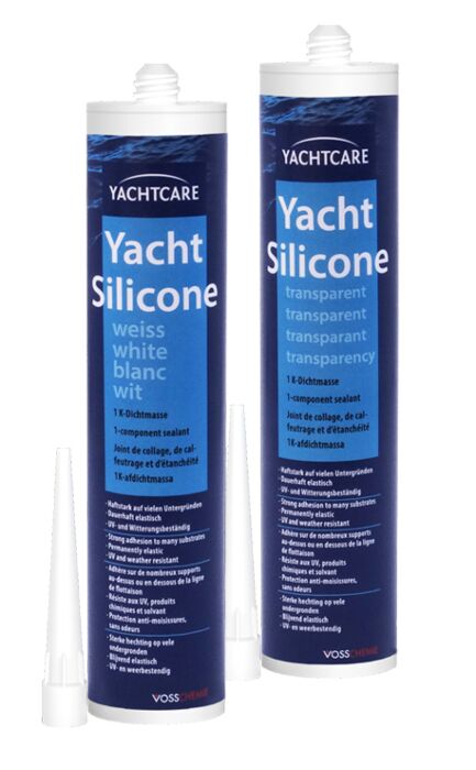YACHT SILICONE ist eine 1-K-Dichtungsmasse auf Basis raumtemperaturvernetzenden Polyorganosiloxan. Sie verbindet dauerhaft elastisch und witterungsbeständig Materialien aller Art miteinander. Es verklebt beispielsweise GFK, Aluminium, Stahl, Glas, Keramik, Holz und andere Kunststoffe. YACHT SILICONE ist lösemittelfrei und geruchsarm.
